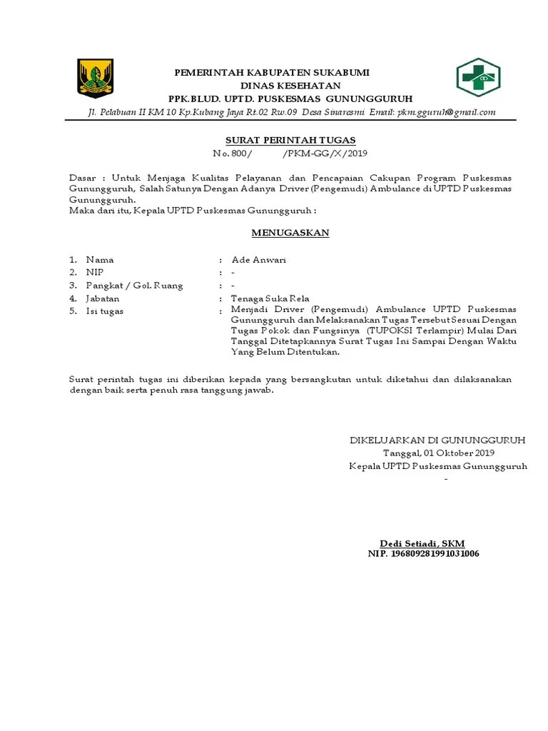 Contoh surat tugas menjadi salah satu jenis surat resmi walaupun dalam pemakaian bersifat internal (hanya pada lingkup instansi/ lembaga). Biasanya, tiap tiap contoh surat ini memiliki template surat resmi . Contoh surat tugas sopir ambulance. Yuk simak contoh surat tugas untuk driver. Menyiapkan contoh surat tugas driver sesuatu hal yang tidak rumit.